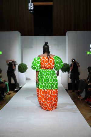 SIKATÍ Design – African Fashion Week Cologne 2025: Grün-Orange Maxikleid mit Puffärmeln & Ethno-Muster (Einzelstück)