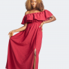 Dunkelrot Off-Shoulder Maxikleid mit Volant und Schlitz – Sommer & Abendkleid