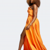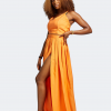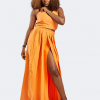 Orangefarbener Zweiteiler mit Crop-Top & Maxirock mit Schlitz – sommerlich, modern & elegant. Ideal für Urlaub, Partys & Abendanlässe.