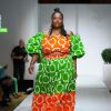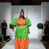 SIKATÍ Design – African Fashion Week Cologne 2025: Grün-Orange Maxikleid mit Puffärmeln & Ethno-Muster (Einzelstück)