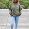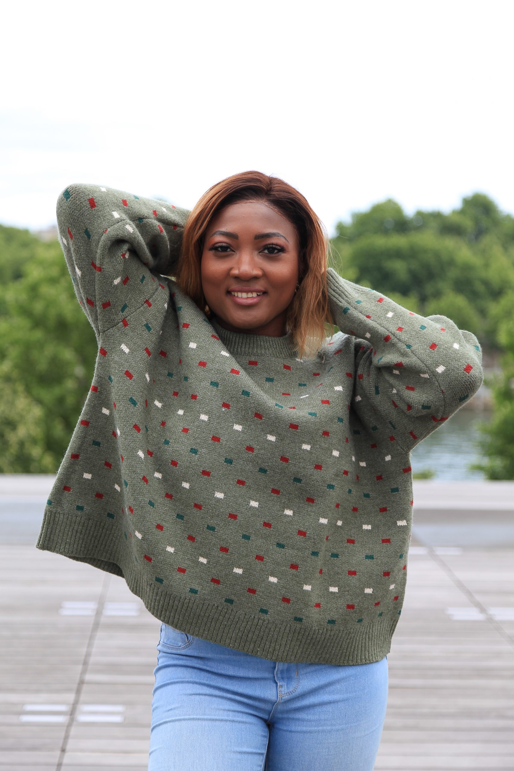 Gemütlicher Pullover in Olivgrün mit buntem Allover-Muster – perfekt für einen legeren Look an kühlen Tagen.