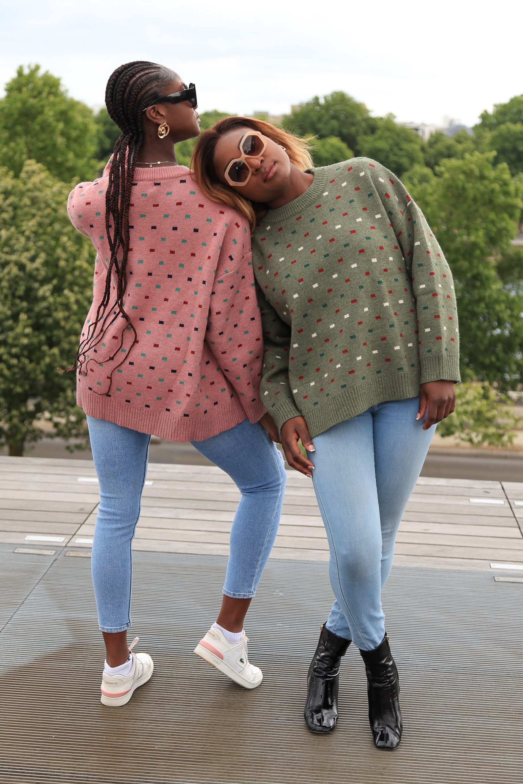 Details: Allover-Muster mit kleinen bunten Rechtecken, Rippbündchen an Saum, Ärmeln und Halsausschnitt