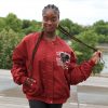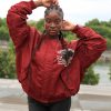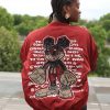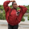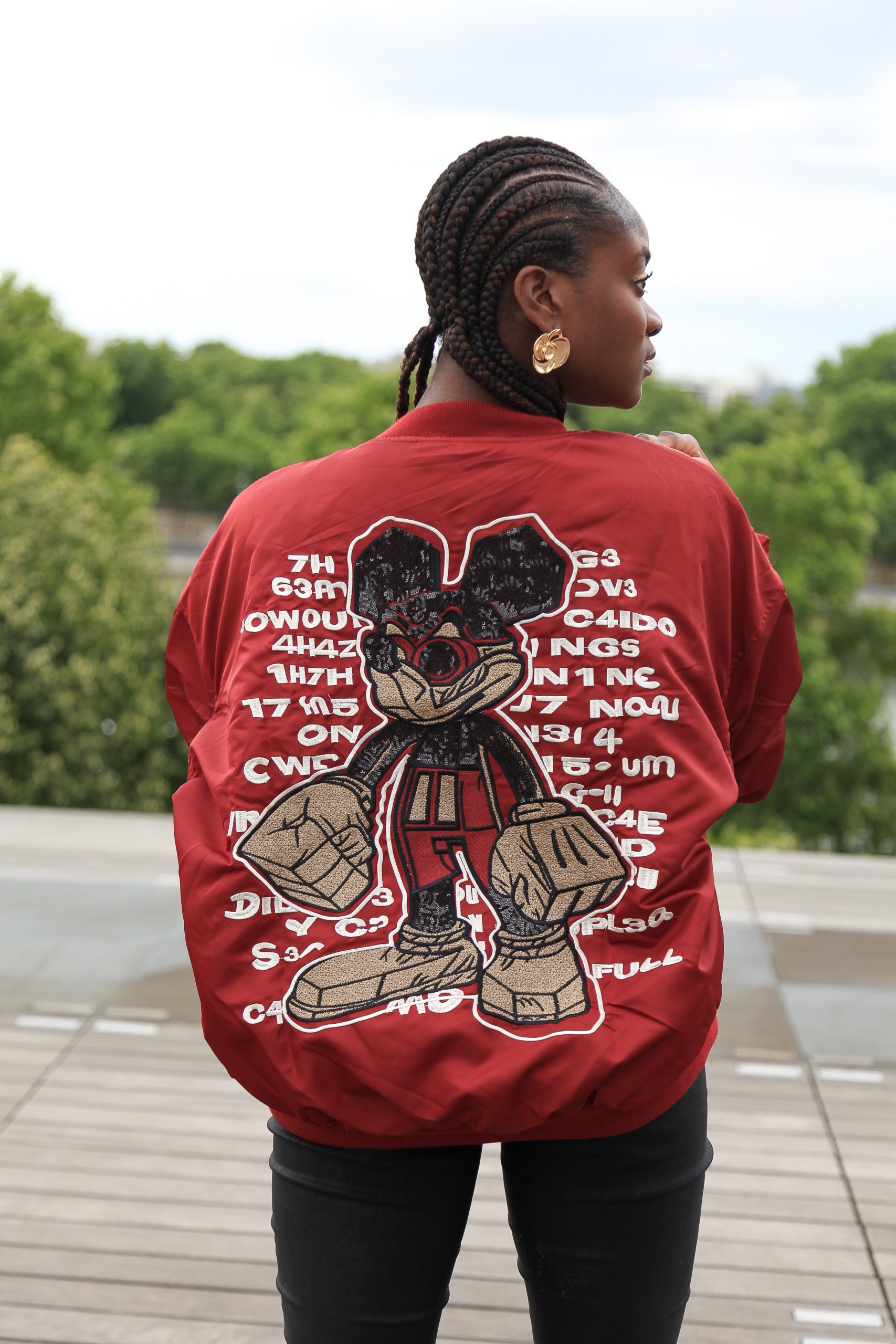 Stylische Oversized Bomberjacke in kräftigem Bordeaux-Rot mit großem Cartoon-Motiv auf der Rückseite und kleiner Bruststickerei. Die Jacke kombiniert Streetwear-Coolness mit einem Hauch Retro-Charme.