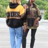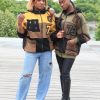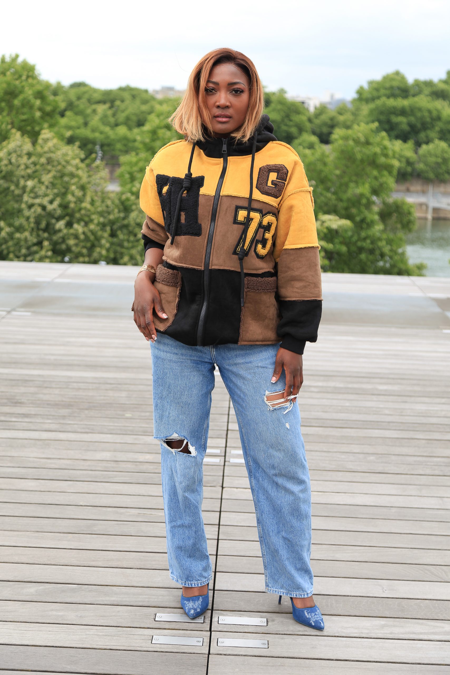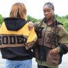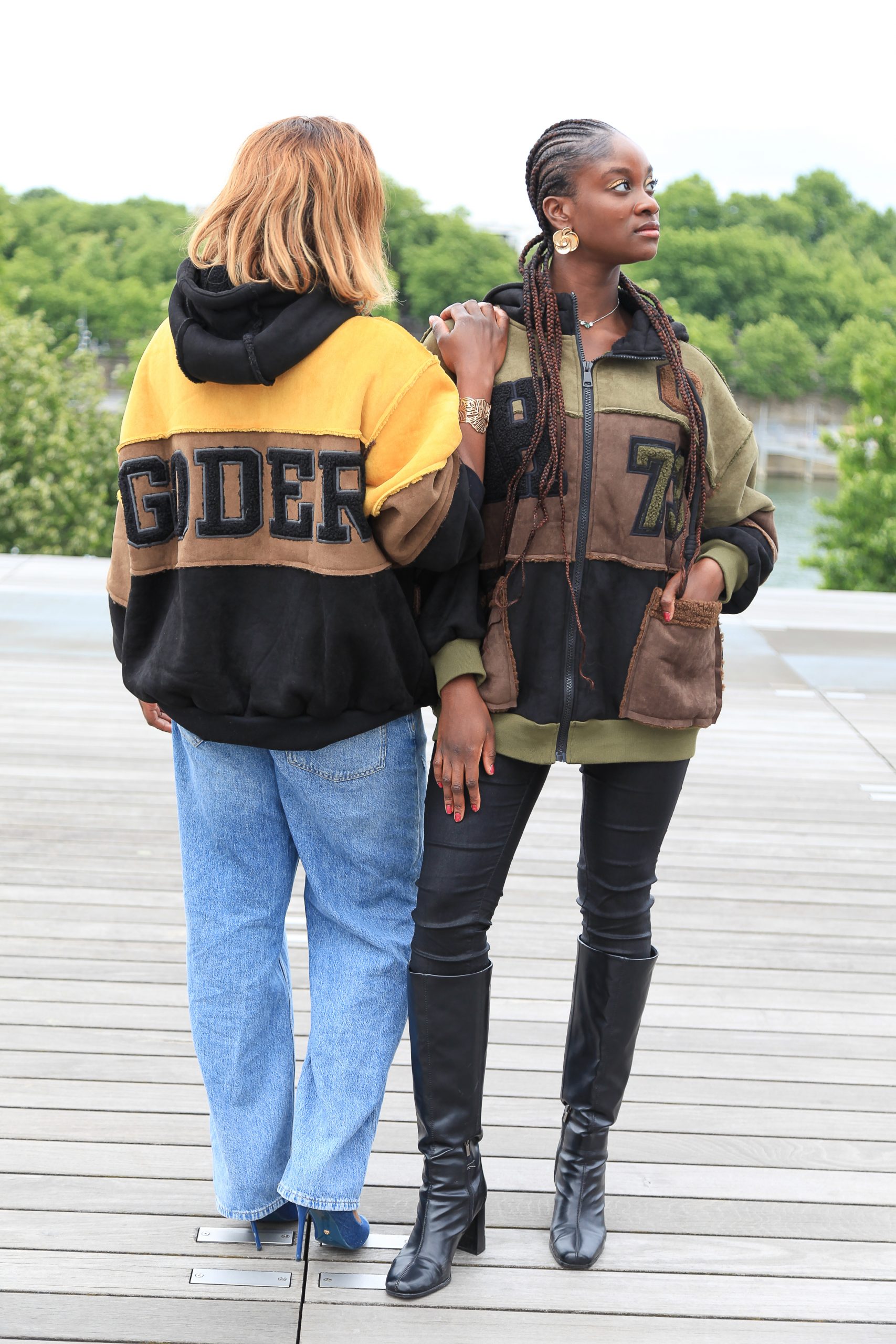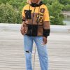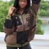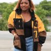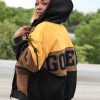 Auffällige Oversized-Jacke im Patchwork-Design mit Kapuze in Gelb, Braun und Schwarz. Ein cooler Statement-Look im College-Stil, perfekt für Streetwear-Fans.