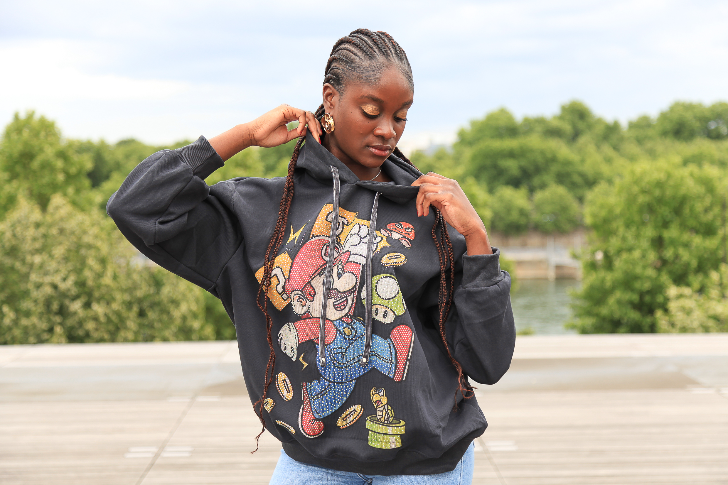 Bequemer Hoodie in klassischem Schwarz mit auffälligem Super-Mario-Frontprint – ein Must-have für alle Gamer- und Streetstyle-Fans.
