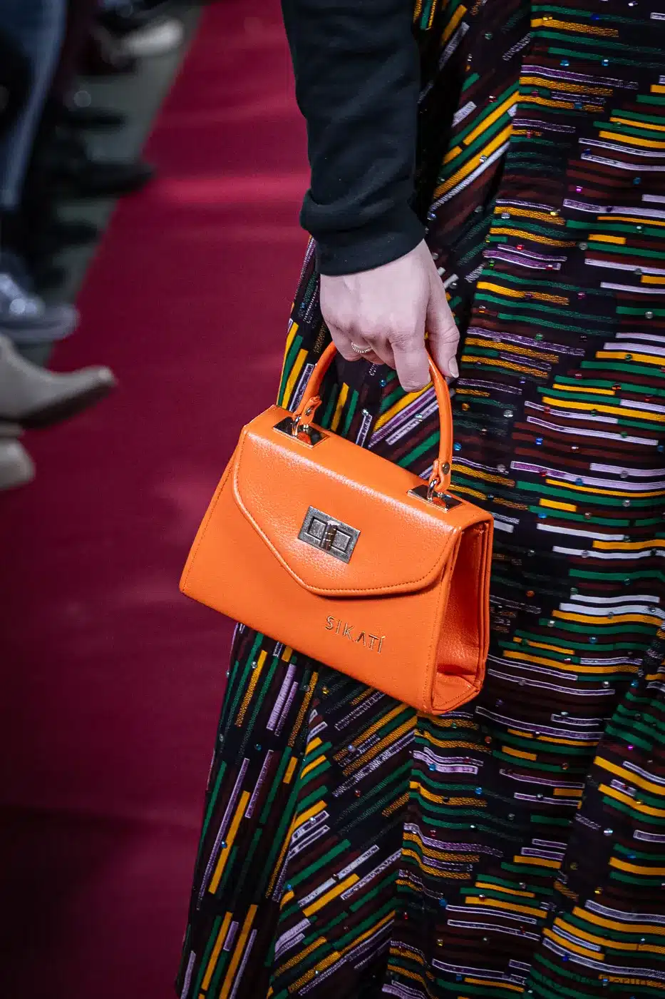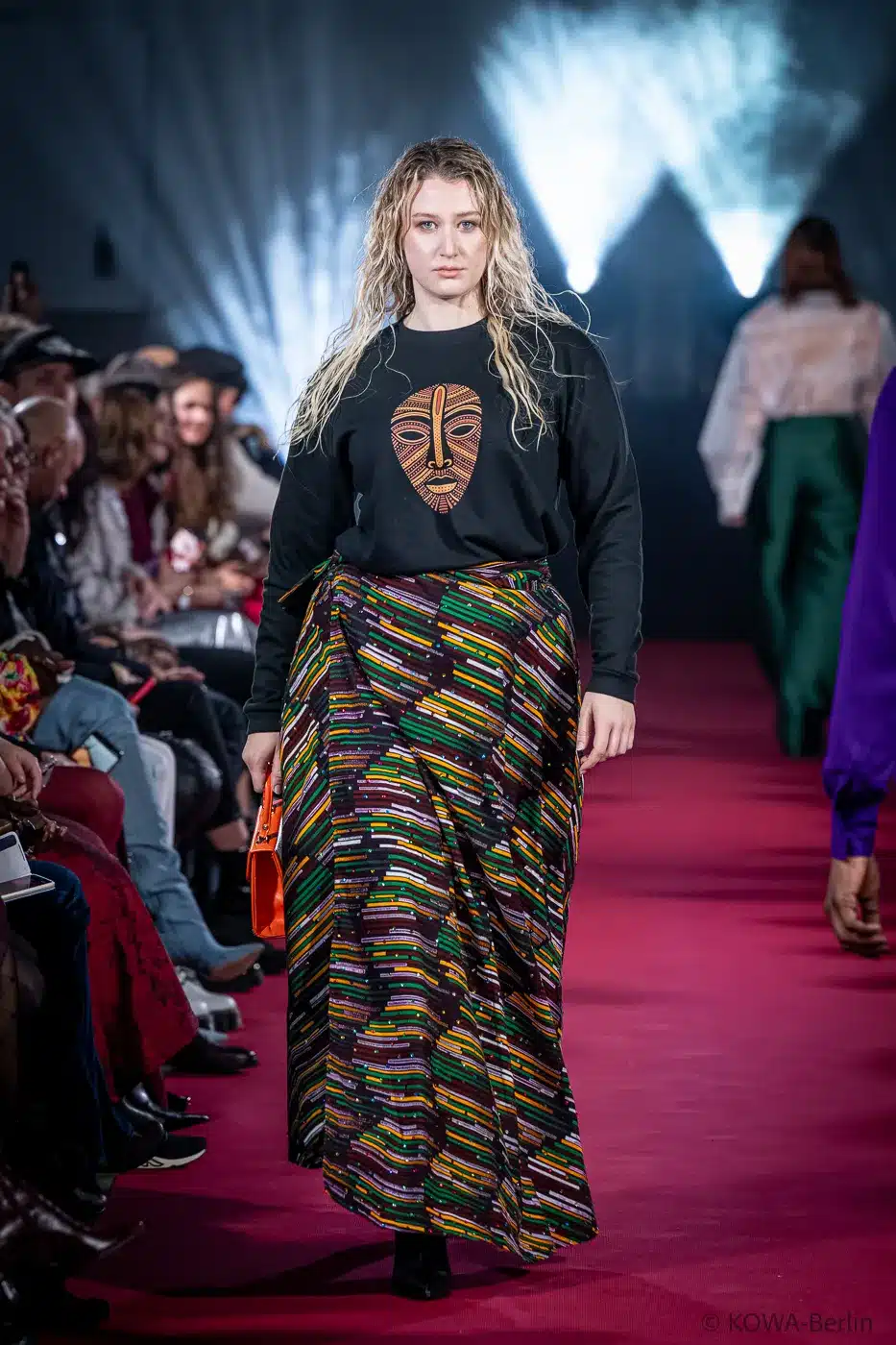 Das SIKATÍ „Naléa“ Designer Look Set ist ein vollständig kuratierter Statement-Look aus drei Teilen: einem Maxi Rock mit mehrfarbigem Print, einem schwarzen Hoodie mit markantem Maskenmotiv und einer orangefarbenen SIKATÍ Handtasche als kraftvollem Akzent.