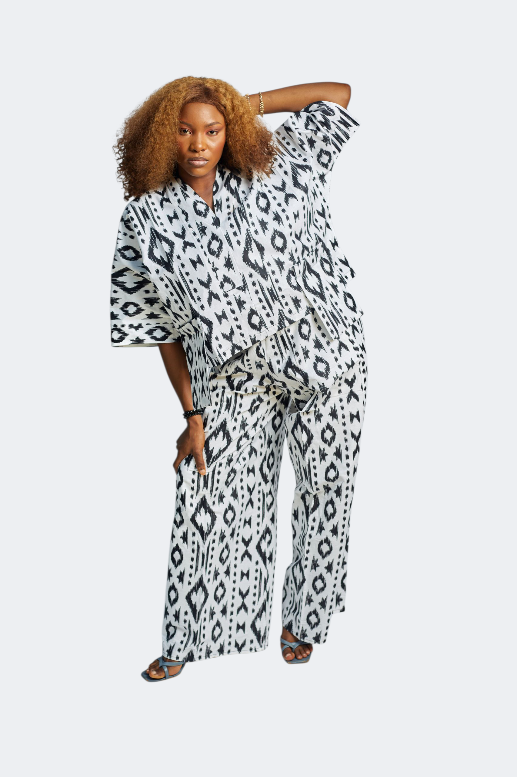 Moderner Zweiteiler bestehend aus lockerem Oberteil mit halblangen Ärmeln und passender Hose im auffälligen Schwarz-Weiß-Print. Der weite Schnitt sorgt für Bewegungsfreiheit und ein angenehmes Tragegefühl. Gefertigt aus 100% Baumwolle, ist das Set atmungsaktiv und alltagstauglich – ein idealer Look für Freizeit, Events oder entspannte Sommertage. Die Hose verfügt über einen elastischen Bund und praktische Eingrifftaschen.